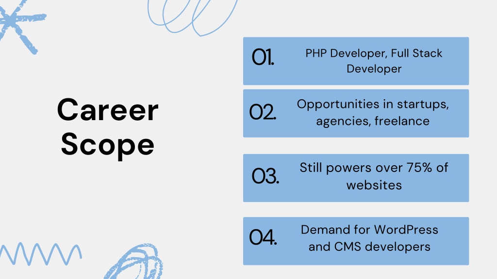 PHP Developer, Full Stack Developer 01. Career Scope • Opportunities in startups, agencies, freelance 02. • Still powers over 75% of websites 03. • Demand for WordPress and CMS developers 04.