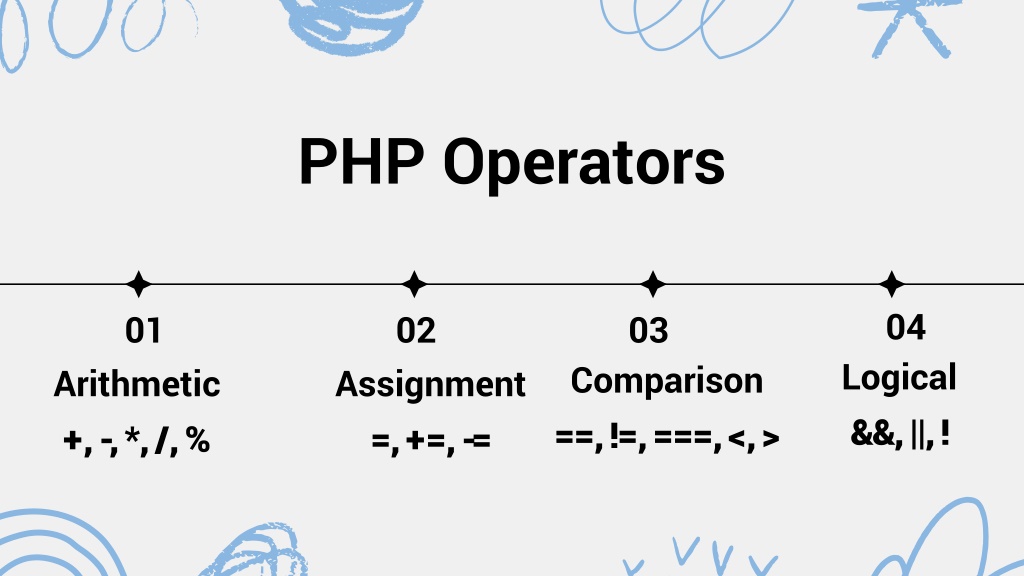 PHP Operators 04 02 01 03 Logical &&, ||, ! Comparison ==, !=, ===, <, > Arithmetic +, -, *, /, % Assignment =, +=, -=
