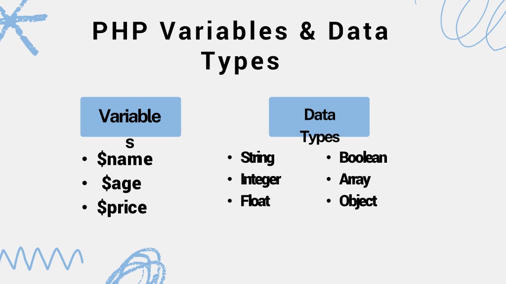 PHP Variables & Data Types Variables Data Types • String • Integer • Float • Boolean • Array • Object • $name • $age • $price