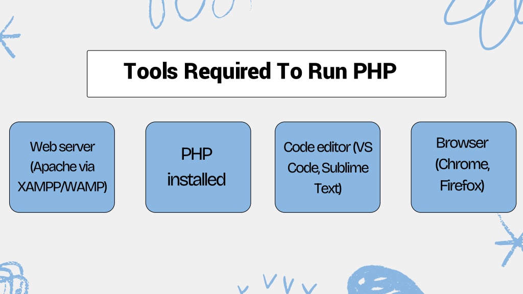 Tools Required To Run PHP Browser (Chrome, Firefox) Web server (Apache via XAMPP/WAMP) Code editor (VS Code, Sublime Text) PHP installed