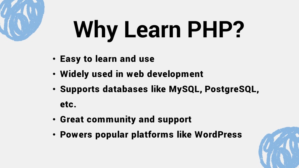 Why Learn PHP? • Easy to learn and use • Widely used in web development • Supports databases like MySQL, PostgreSQL, etc. • Great community and support • Powers popular platforms like WordPress