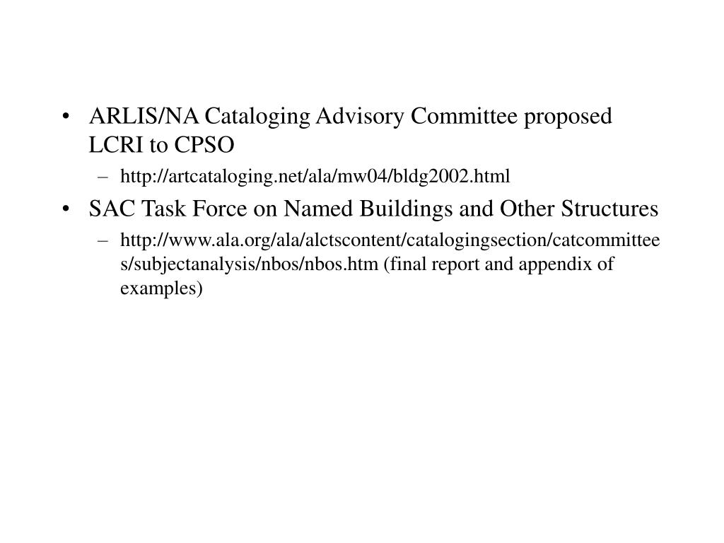 ARLIS/NA Cataloging Advisory Committee proposed LCRI to CPSO • http://artcataloging.net/ala/mw04/bldg2002.html • SAC Task Force on Named Buildings and Other Structures • http://www.ala.org/ala/alctscontent/catalogingsection/catcommittees/subjectanalysis/nbos/nbos.htm (final report and appendix of examples)