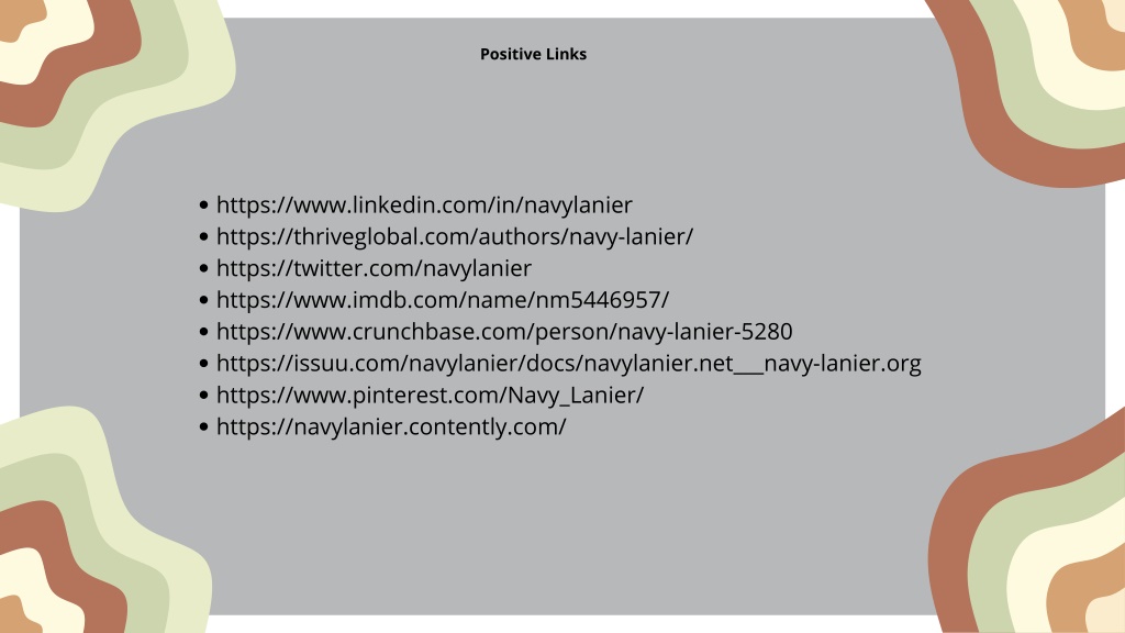 Positive Links https://www.linkedin.com/in/navylanier https://thriveglobal.com/authors/navy-lanier/ https://twitter.com/navylanier https://www.imdb.com/name/nm5446957/ https://www.crunchbase.com/person/navy-lanier-5280 https://issuu.com/navylanier/docs/navylanier.net___navy-lanier.org https://www.pinterest.com/Navy_Lanier/ https://navylanier.contently.com/