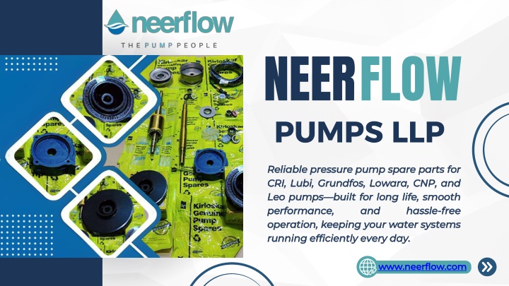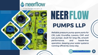 About Company At Neerflow Pumps LLP, we offer a comprehensive range of high-quality pressure pump spare parts compatible with top brands including CRI, Lubi, Grundfos, Lowara, CNP, and Leo. Our inventory includes precision-engineered components such as seals, impellers, bearings, diaphragms, gaskets, and other essential parts designed to extend pump life and ensure optimal performance. Whether you need replacements for maintenance, repairs, or performance upgrades, our genuine and durable spare parts deliver reliable flow, improved efficiency, and long-term durability for all your pressure pump systems. Trust Neerflow for premium parts that keep your pumps running smoothly and efficiently. www.neerflow.com