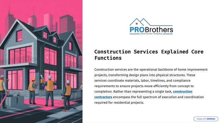 This presentation explains the role construction services play in residential home projects from planning through completion. Framed around core construction functions, it explores how services such as framing, structural work, coordination, and finishing support successful project outcomes. Drawing on comprehensive project management experience from probrothers, the content highlights how professional construction services ensure quality, safety, and efficiency. The presentation also discusses how construction teams coordinate with designers, inspectors, and homeowners throughout the process.