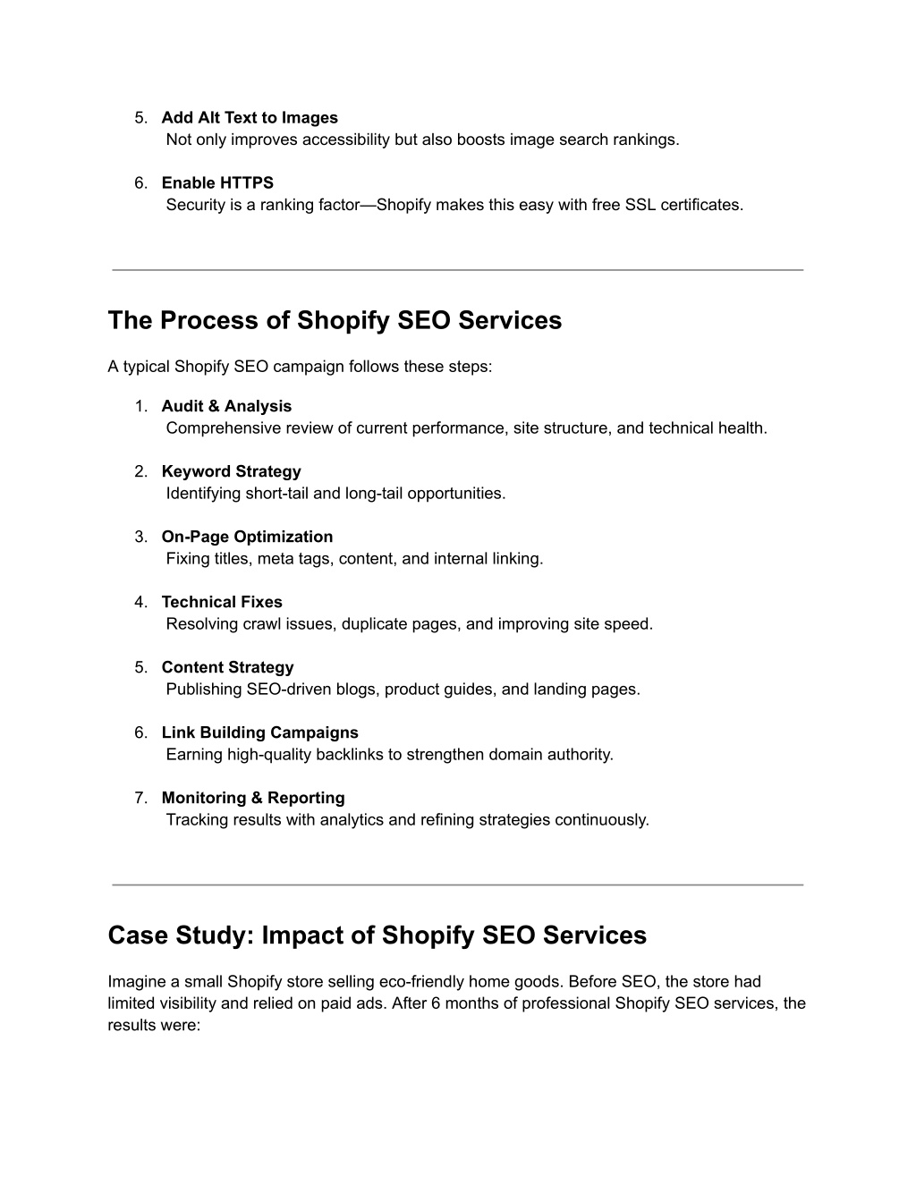 5. Add Alt Text to Images Not only improves accessibility but also boosts image search rankings. 6. Enable HTTPS Security is a ranking factor—Shopify makes this easy with free SSL certificates. The Process of Shopify SEO Services A typical Shopify SEO campaign follows these steps: 1. Audit & Analysis Comprehensive review of current performance, site structure, and technical health. 2. Keyword Strategy Identifying short-tail and long-tail opportunities. 3. On-Page Optimization Fixing titles, meta tags, content, and internal linking. 4. Technical Fixes Resolving crawl issues, duplicate pages, and improving site speed. 5. Content Strategy Publishing SEO-driven blogs, product guides, and landing pages. 6. Link Building Campaigns Earning high-quality backlinks to strengthen domain authority. 7. Monitoring & Reporting Tracking results with analytics and refining strategies continuously. Case Study: Impact of Shopify SEO Services Imagine a small Shopify store selling eco-friendly home goods. Before SEO, the store had limited visibility and relied on paid ads. After 6 months of professional Shopify SEO services, the results were: