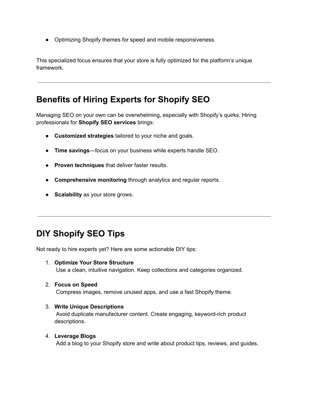 ● Optimizing Shopify themes for speed and mobile responsiveness. This specialized focus ensures that your store is fully optimized for the platform’s unique framework. Benefits of Hiring Experts for Shopify SEO Managing SEO on your own can be overwhelming, especially with Shopify’s quirks. Hiring professionals for Shopify SEO services brings: ● Customized strategies tailored to your niche and goals. ● Time savings—focus on your business while experts handle SEO. ● Proven techniques that deliver faster results. ● Comprehensive monitoring through analytics and regular reports. ● Scalability as your store grows. DIY Shopify SEO Tips Not ready to hire experts yet? Here are some actionable DIY tips: 1. Optimize Your Store Structure Use a clean, intuitive navigation. Keep collections and categories organized. 2. Focus on Speed Compress images, remove unused apps, and use a fast Shopify theme. 3. Write Unique Descriptions Avoid duplicate manufacturer content. Create engaging, keyword-rich product descriptions. 4. Leverage Blogs Add a blog to your Shopify store and write about product tips, reviews, and guides.