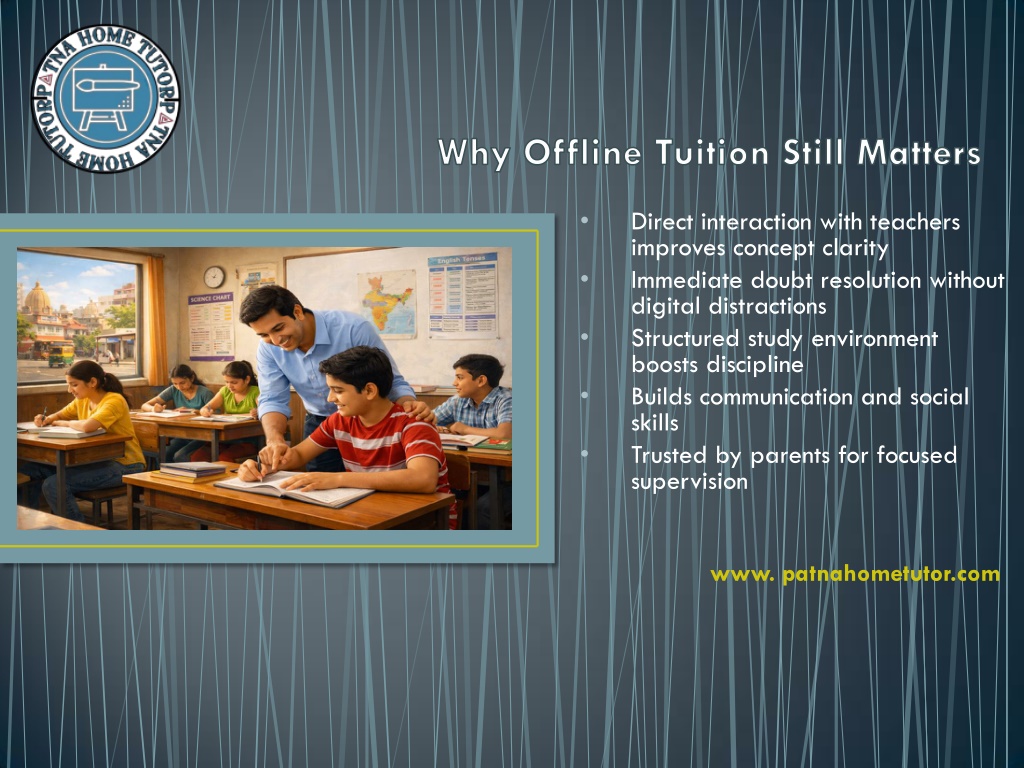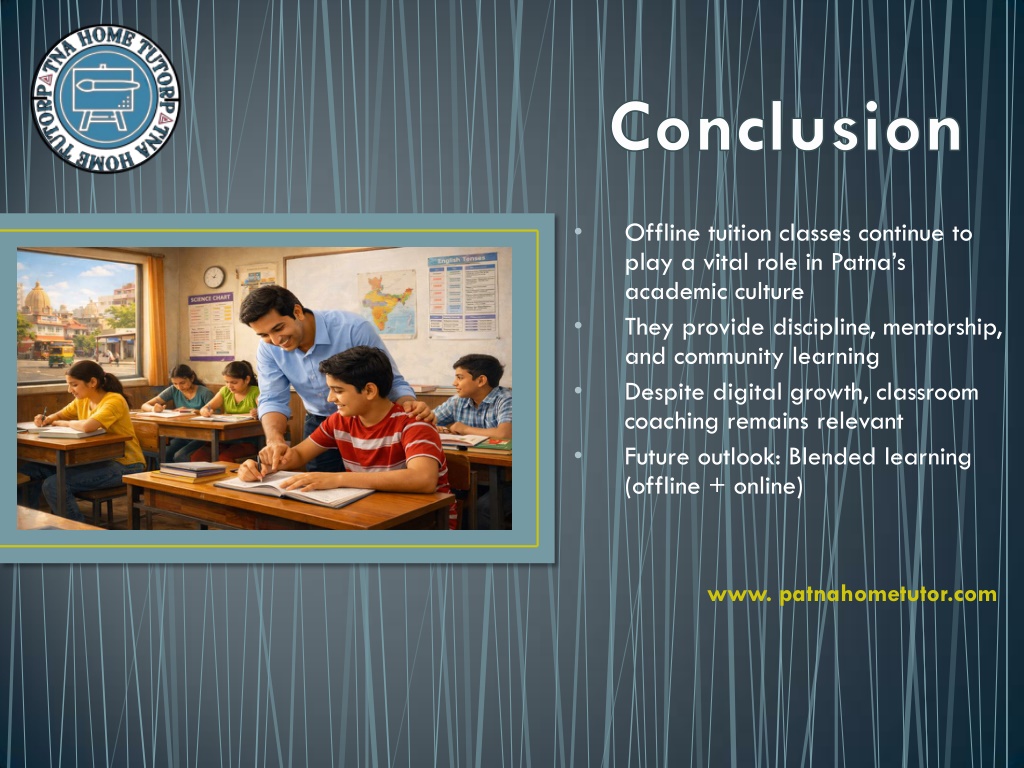 • Offline tuition classes continue to play a vital role in Patna’s academic culture They provide discipline, mentorship, and community learning Despite digital growth, classroom coaching remains relevant Future outlook: Blended learning (offline + online) • • • www. patnahometutor.com