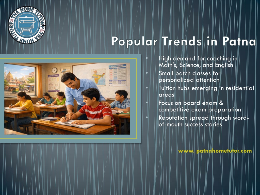 • High demand for coaching in Math's, Science, and English Small batch classes for personalized attention Tuition hubs emerging in residential areas Focus on board exam & competitive exam preparation Reputation spread through word- of-mouth success stories • • • • www. patnahometutor.com