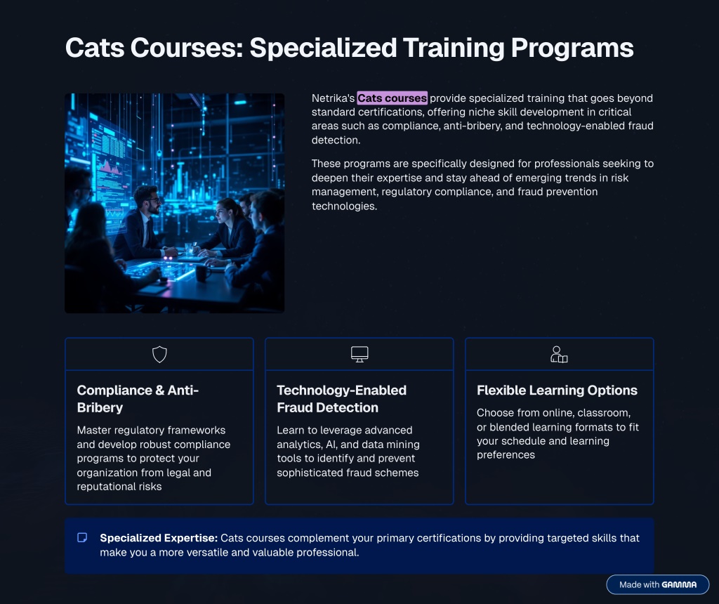 7. Cats Courses: Specialized Training Programs Netrika's Cats courses provide specialized training that goes beyond standard certifications, offering niche skill development in critical areas such as compliance, anti-bribery, and technology-enabled fraud detection. These programs are specifically designed for professionals seeking to deepen their expertise and stay ahead of emerging trends in risk management, regulatory compliance, and fraud prevention technologies. Compliance & Anti- Bribery Technology-Enabled Fraud Detection Flexible Learning Options Choose from online, classroom, or blended learning formats to fit your schedule and learning preferences Master regulatory frameworks and develop robust compliance programs to protect your organization from legal and reputational risks Learn to leverage advanced analytics, AI, and data mining tools to identify and prevent sophisticated fraud schemes Specialized Expertise: Cats courses complement your primary certifications by providing targeted skills that make you a more versatile and valuable professional.