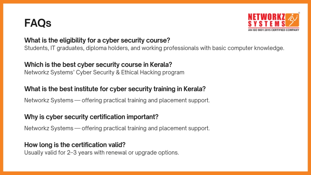 7. FAQs • What is the eligibility for a cyber security course? • Students, IT graduates, diploma holders, and working professionals with basic computer knowledge. • Which is the best cyber security course in Kerala? • Networkz Systems’ Cyber Security & Ethical Hacking program • What is the best institute for cyber security training in Kerala? • Networkz Systems — offering practical training and placement support. • Why is cyber security certification important? • Networkz Systems — offering practical training and placement support. • How long is the certification valid? • Usually valid for 2–3 years with renewal or upgrade options.