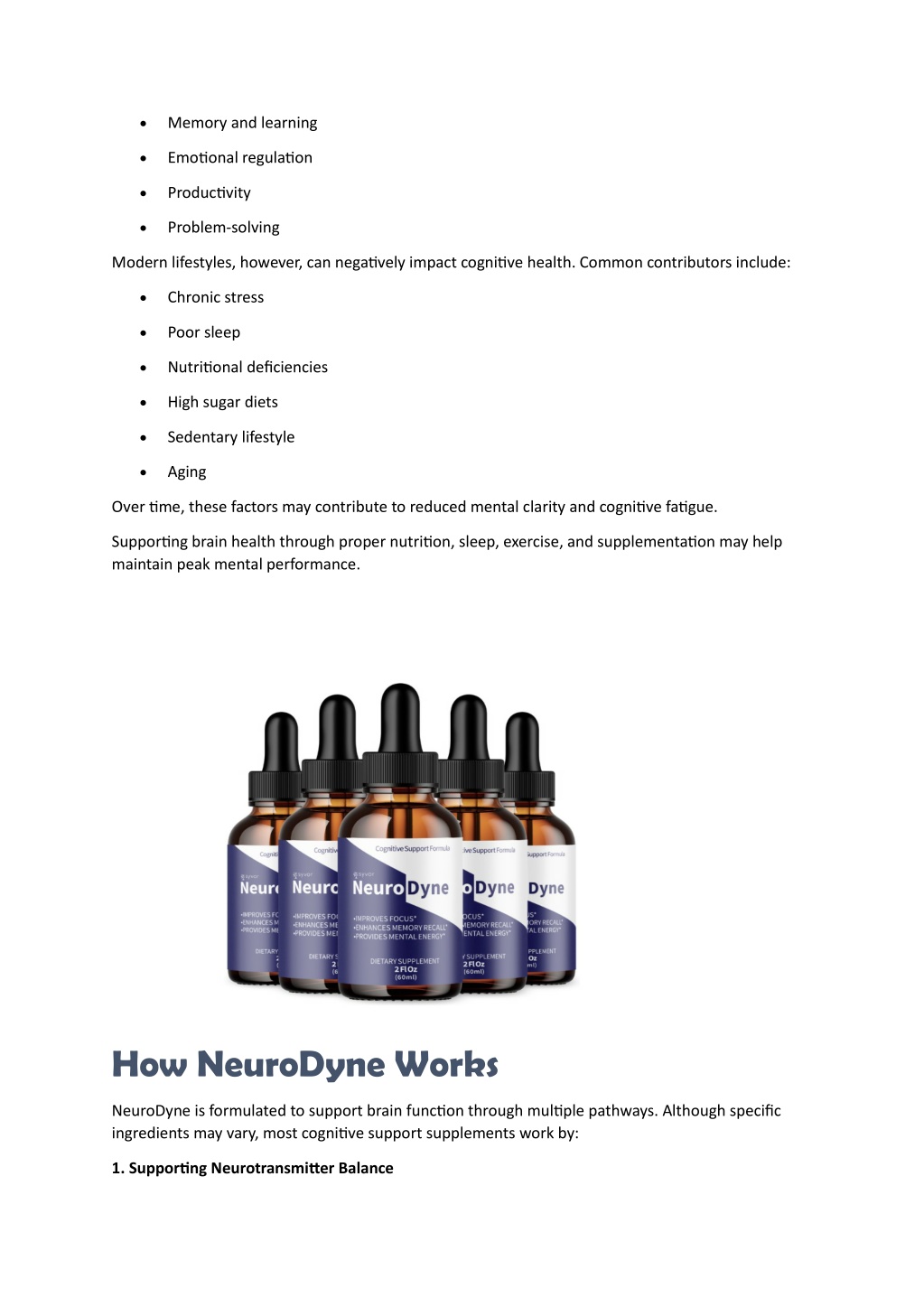 • Memory and learning • Emotional regulation • Productivity • Problem-solving Modern lifestyles, however, can negatively impact cognitive health. Common contributors include: • Chronic stress • Poor sleep • Nutritional deficiencies • High sugar diets • Sedentary lifestyle • Aging Over time, these factors may contribute to reduced mental clarity and cognitive fatigue. Supporting brain health through proper nutrition, sleep, exercise, and supplementation may help maintain peak mental performance. How NeuroDyne Works NeuroDyne is formulated to support brain function through multiple pathways. Although specific ingredients may vary, most cognitive support supplements work by: 1. Supporting Neurotransmitter Balance