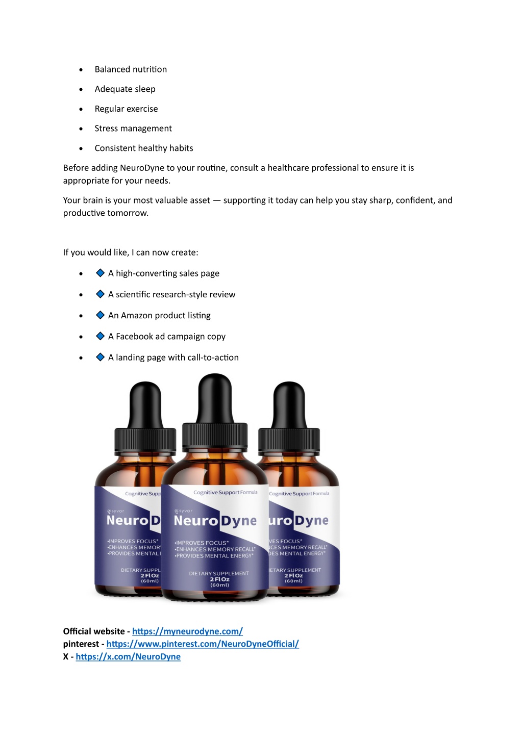 • Balanced nutrition • Adequate sleep • Regular exercise • Stress management • Consistent healthy habits Before adding NeuroDyne to your routine, consult a healthcare professional to ensure it is appropriate for your needs. Your brain is your most valuable asset — supporting it today can help you stay sharp, confident, and productive tomorrow. If you would like, I can now create: • A high-converting sales page • A scientific research-style review • An Amazon product listing • A Facebook ad campaign copy • A landing page with call-to-action Official website - https://myneurodyne.com/ pinterest - https://www.pinterest.com/NeuroDyneOfficial/ X - https://x.com/NeuroDyne