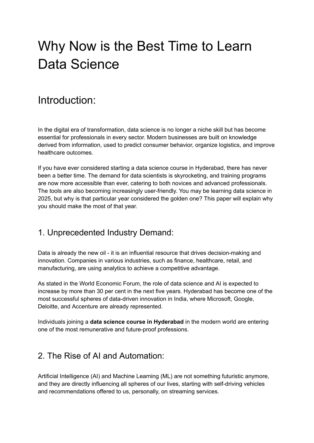 1. Why Now is the Best Time to Learn Data Science Introduction: In the digital era of transformation, data science is no longer a niche skill but has become essential for professionals in every sector. Modern businesses are built on knowledge derived from information, used to predict consumer behavior, organize logistics, and improve healthcare outcomes. If you have ever considered starting a data science course in Hyderabad, there has never been a better time. The demand for data scientists is skyrocketing, and training programs are now more accessible than ever, catering to both novices and advanced professionals. The tools are also becoming increasingly user-friendly. You may be learning data science in 2025, but why is that particular year considered the golden one? This paper will explain why you should make the most of that year. 1. Unprecedented Industry Demand: Data is already the new oil - it is an influential resource that drives decision-making and innovation. Companies in various industries, such as finance, healthcare, retail, and manufacturing, are using analytics to achieve a competitive advantage. As stated in the World Economic Forum, the role of data science and AI is expected to increase by more than 30 per cent in the next five years. Hyderabad has become one of the most successful spheres of data-driven innovation in India, where Microsoft, Google, Deloitte, and Accenture are already represented. Individuals joining a data science course in Hyderabad in the modern world are entering one of the most remunerative and future-proof professions. 2. The Rise of AI and Automation: Artificial Intelligence (AI) and Machine Learning (ML) are not something futuristic anymore, and they are directly influencing all spheres of our lives, starting with self-driving vehicles and recommendations offered to us, personally, on streaming services.
