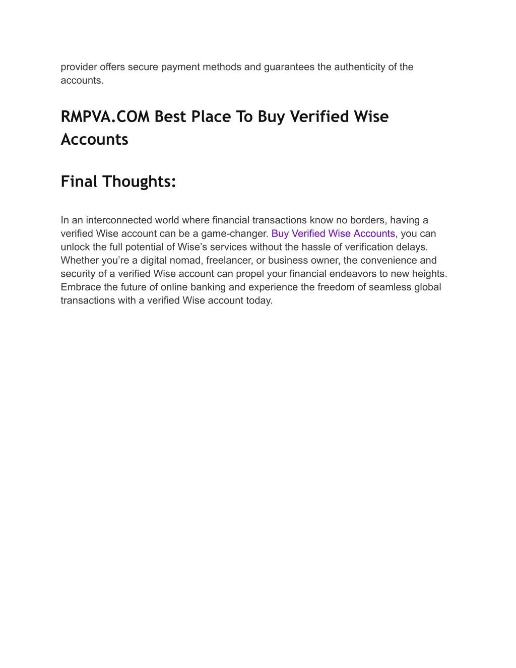 provider offers secure payment methods and guarantees the authenticity of the accounts. RMPVA.COM Best Place To Buy Verified Wise Accounts Final Thoughts: In an interconnected world where financial transactions know no borders, having a verified Wise account can be a game-changer. Buy Verified Wise Accounts, you can unlock the full potential of Wise’s services without the hassle of verification delays. Whether you’re a digital nomad, freelancer, or business owner, the convenience and security of a verified Wise account can propel your financial endeavors to new heights. Embrace the future of online banking and experience the freedom of seamless global transactions with a verified Wise account today.