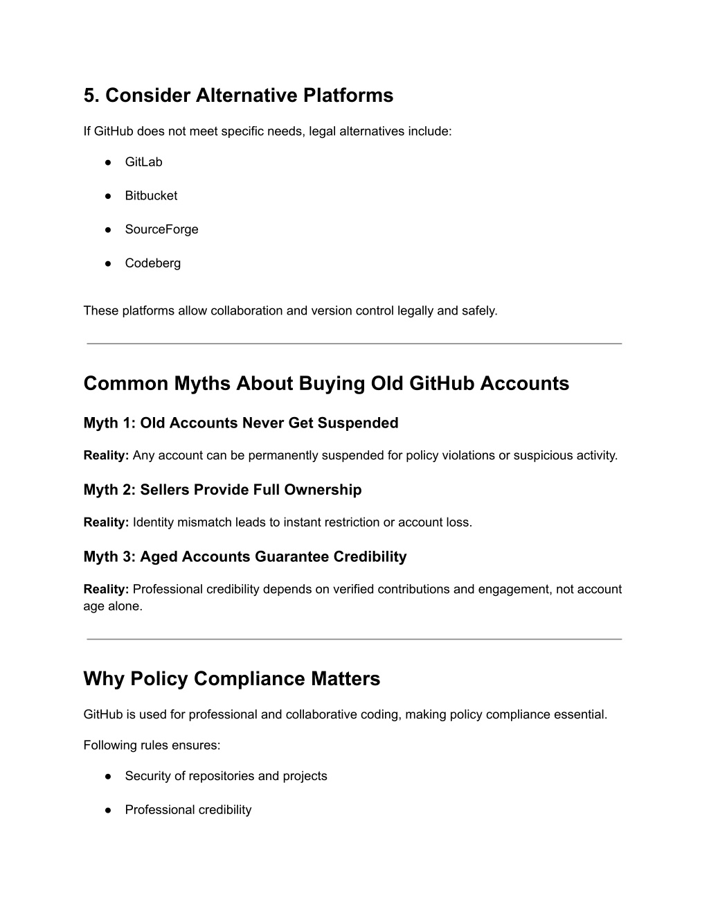 5. Consider Alternative Platforms If GitHub does not meet specific needs, legal alternatives include: ● GitLab ● Bitbucket ● SourceForge ● Codeberg These platforms allow collaboration and version control legally and safely. Common Myths About Buying Old GitHub Accounts Myth 1: Old Accounts Never Get Suspended Reality: Any account can be permanently suspended for policy violations or suspicious activity. Myth 2: Sellers Provide Full Ownership Reality: Identity mismatch leads to instant restriction or account loss. Myth 3: Aged Accounts Guarantee Credibility Reality: Professional credibility depends on verified contributions and engagement, not account age alone. Why Policy Compliance Matters GitHub is used for professional and collaborative coding, making policy compliance essential. Following rules ensures: ● Security of repositories and projects ● Professional credibility