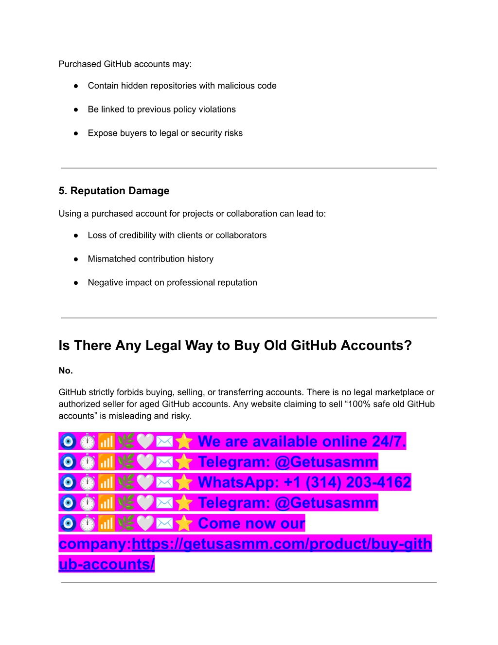Purchased GitHub accounts may: ● Contain hidden repositories with malicious code ● Be linked to previous policy violations ● Expose buyers to legal or security risks 5. Reputation Damage Using a purchased account for projects or collaboration can lead to: ● Loss of credibility with clients or collaborators ● Mismatched contribution history ● Negative impact on professional reputation Is There Any Legal Way to Buy Old GitHub Accounts? No. GitHub strictly forbids buying, selling, or transferring accounts. There is no legal marketplace or authorized seller for aged GitHub accounts. Any website claiming to sell “100% safe old GitHub accounts” is misleading and risky. ?⏱???✉⭐ We are available online 24/7. ?⏱???✉⭐ Telegram: @Getusasmm ?⏱???✉⭐ WhatsApp: +1 (314) 203-4162 ?⏱???✉⭐ Telegram: @Getusasmm ?⏱???✉⭐ Come now our company:https://getusasmm.com/product/buy-gith ub-accounts/