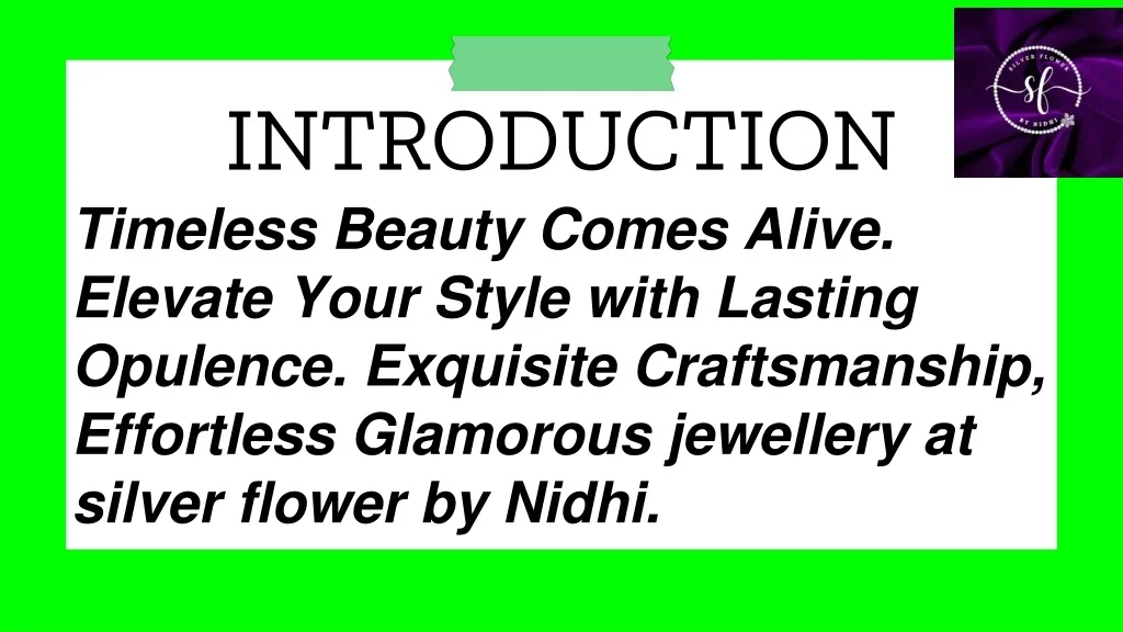 INTRODUCTION Timeless Beauty Comes Alive. Elevate Your Style with Lasting Opulence. Exquisite Craftsmanship, Effortless Glamorous jewellery at silver flower by Nidhi.