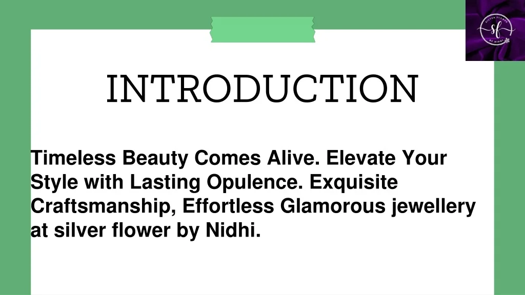 INTRODUCTION Timeless Beauty Comes Alive. Elevate Your Style with Lasting Opulence. Exquisite Craftsmanship, Effortless Glamorous jewellery at silver flower by Nidhi.