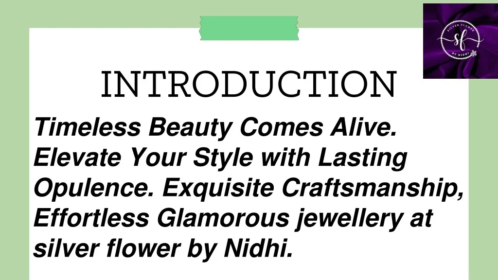 INTRODUCTION Timeless Beauty Comes Alive. Elevate Your Style with Lasting Opulence. Exquisite Craftsmanship, Effortless Glamorous jewellery at silver flower by Nidhi.