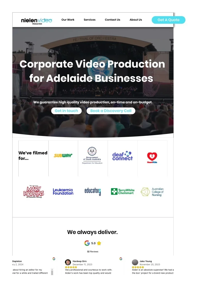 Get A Quote Home Our Work Services Contact Us About Us Corporate Video Production for Adelaide Businesses We guarantee high quality video production, on-time and on-budget. We guarantee high quality video production, on-time and on-budget. Get in touch Book a Discovery Call We've ?lmed for... We always deliver. 5.0 32 Reviews Stapleton ary 2, 2024 Hardeep Girn December 11, 2023 Jake Young November 20, 2023 about hiring an editor for my nnel for a while and trailed different Very professional and courteous to work with. Aiden's work has been top quality and would Aiden is an absolute superstar! We had a the box' project for a brand new product