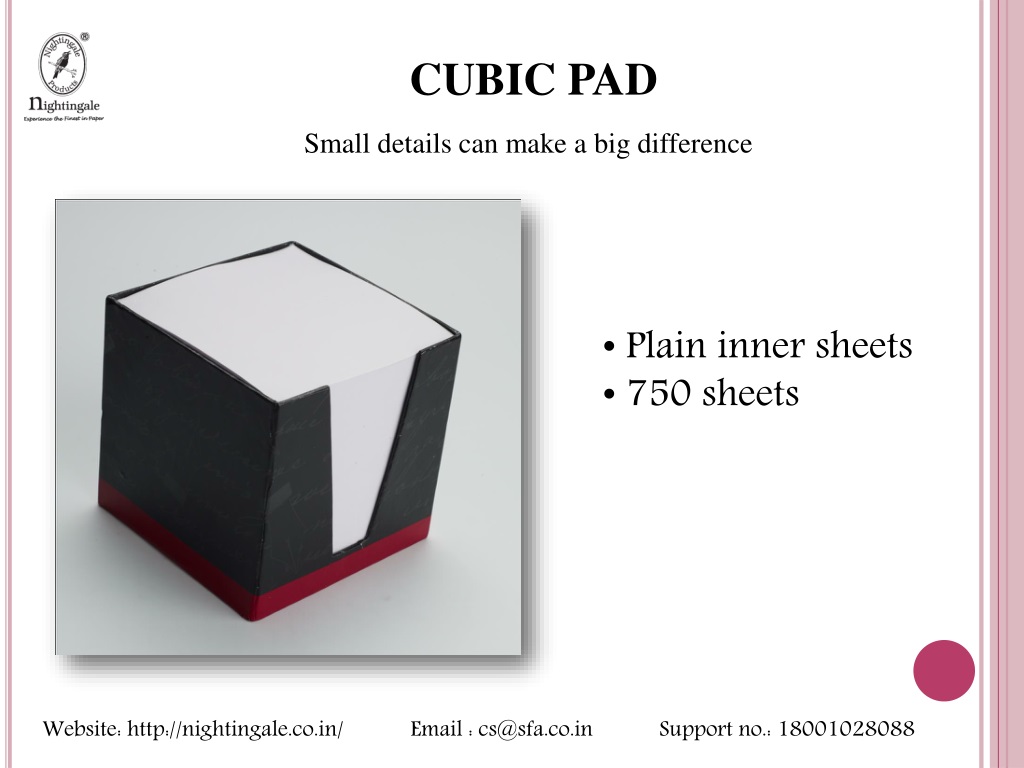 CUBIC PAD Small details can make a big difference • Plain inner sheets • 750 sheets Website: http://nightingale.co.in/ Email : cs@sfa.co.in Support no.: 18001028088