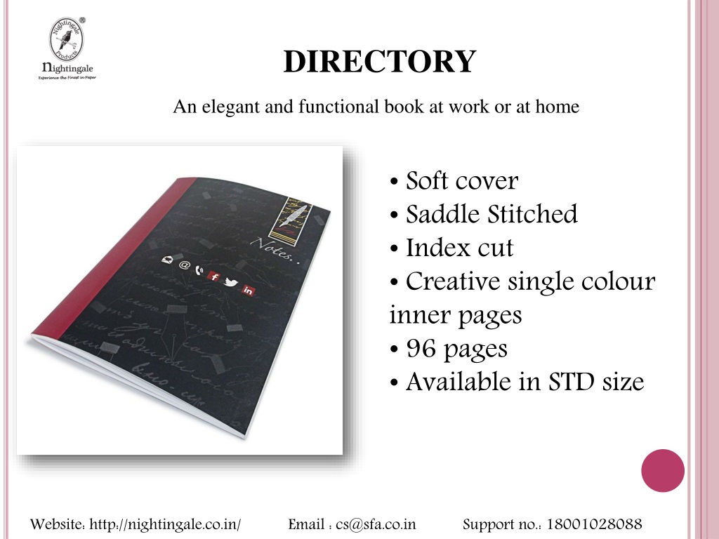 DIRECTORY An elegant and functional book at work or at home • Soft cover • Saddle Stitched • Index cut • Creative single colour inner pages • 96 pages • Available in STD size Website: http://nightingale.co.in/ Email : cs@sfa.co.in Support no.: 18001028088
