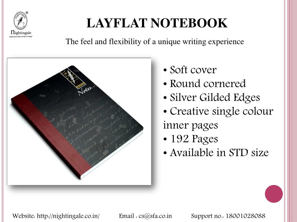 LAYFLAT NOTEBOOK The feel and flexibility of a unique writing experience • Soft cover • Round cornered • Silver Gilded Edges • Creative single colour inner pages • 192 Pages • Available in STD size Website: http://nightingale.co.in/ Email : cs@sfa.co.in Support no.: 18001028088