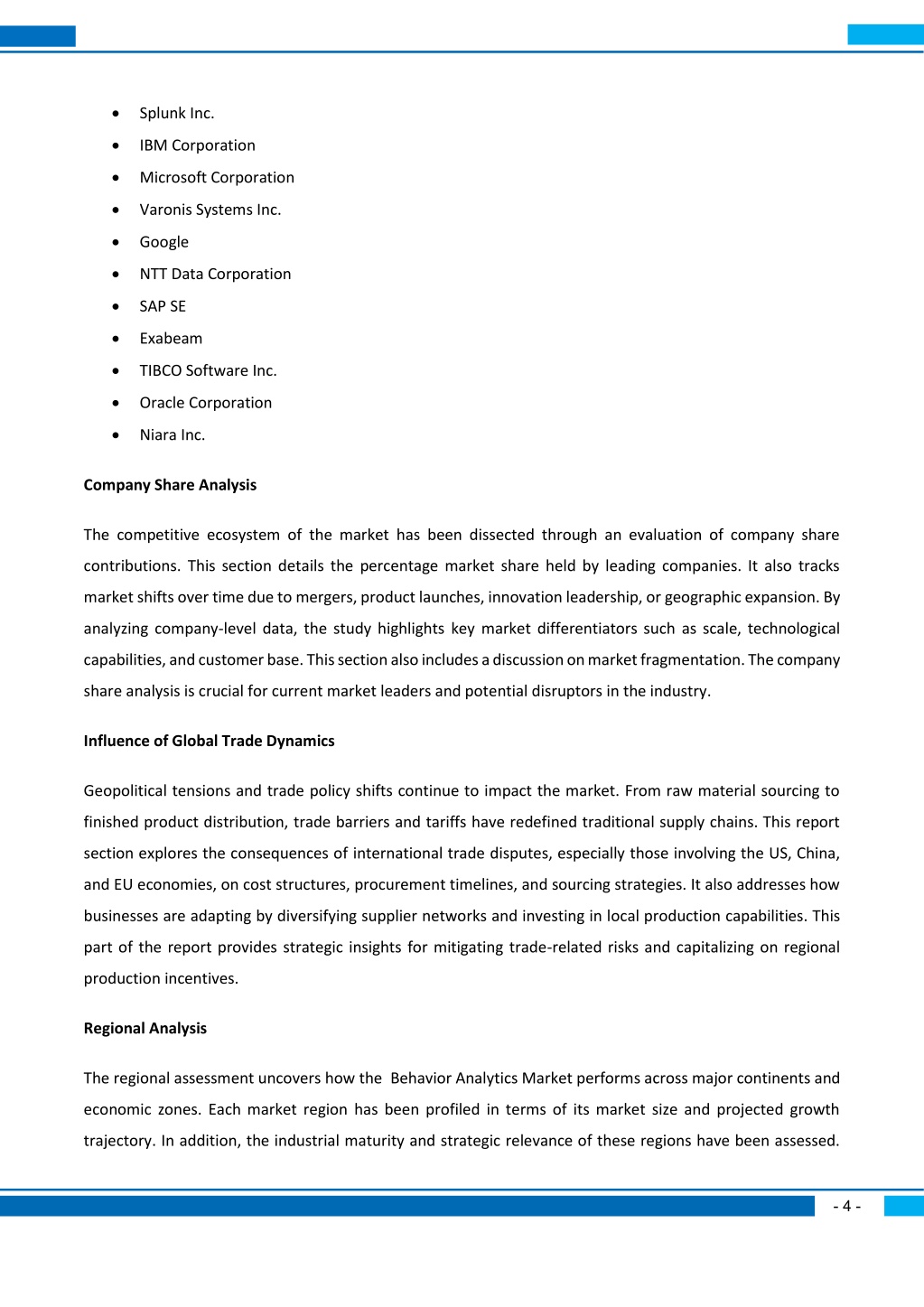 •Splunk Inc. •IBM Corporation •Microsoft Corporation •Varonis Systems Inc. •Google •NTT Data Corporation •SAP SE •Exabeam •TIBCO Software Inc. •Oracle Corporation •Niara Inc. Company Share Analysis The competitive ecosystem of the market has been dissected through an evaluation of company share contributions. This section details the percentage market share held by leading companies. It also tracks market shifts over time due to mergers, product launches, innovation leadership, or geographic expansion. By analyzing company-level data, the study highlights key market differentiators such as scale, technological capabilities, and customer base. This section also includes a discussion on market fragmentation. The company share analysis is crucial for current market leaders and potential disruptors in the industry. Influence of Global Trade Dynamics Geopolitical tensions and trade policy shifts continue to impact the market. From raw material sourcing to finished product distribution, trade barriers and tariffs have redefined traditional supply chains. This report section explores the consequences of international trade disputes, especially those involving the US, China, and EU economies, on cost structures, procurement timelines, and sourcing strategies. It also addresses how businesses are adapting by diversifying supplier networks and investing in local production capabilities. This part of the report provides strategic insights for mitigating trade-related risks and capitalizing on regional production incentives. Regional Analysis The regional assessment uncovers how the Behavior Analytics Market performs across major continents and economic zones. Each market region has been profiled in terms of its market size and projected growth trajectory. In addition, the industrial maturity and strategic relevance of these regions have been assessed. - 4 -