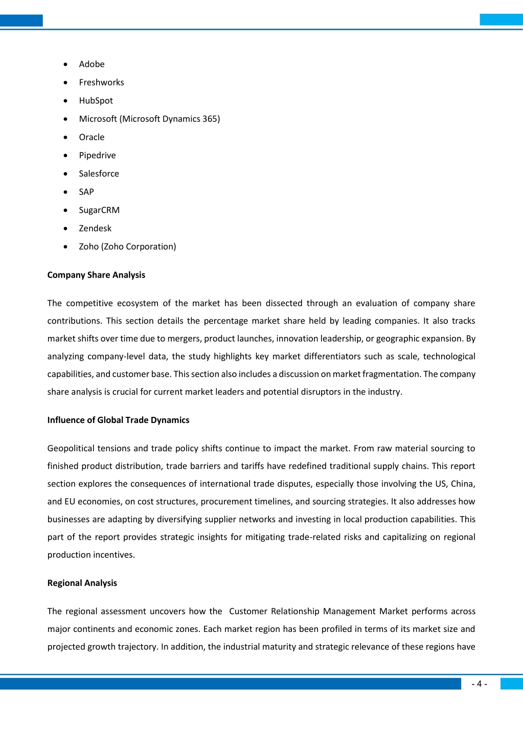 •Adobe •Freshworks •HubSpot •Microsoft (Microsoft Dynamics 365) •Oracle •Pipedrive •Salesforce •SAP •SugarCRM •Zendesk •Zoho (Zoho Corporation) Company Share Analysis The competitive ecosystem of the market has been dissected through an evaluation of company share contributions. This section details the percentage market share held by leading companies. It also tracks market shifts over time due to mergers, product launches, innovation leadership, or geographic expansion. By analyzing company-level data, the study highlights key market differentiators such as scale, technological capabilities, and customer base. This section also includes a discussion on market fragmentation. The company share analysis is crucial for current market leaders and potential disruptors in the industry. Influence of Global Trade Dynamics Geopolitical tensions and trade policy shifts continue to impact the market. From raw material sourcing to finished product distribution, trade barriers and tariffs have redefined traditional supply chains. This report section explores the consequences of international trade disputes, especially those involving the US, China, and EU economies, on cost structures, procurement timelines, and sourcing strategies. It also addresses how businesses are adapting by diversifying supplier networks and investing in local production capabilities. This part of the report provides strategic insights for mitigating trade-related risks and capitalizing on regional production incentives. Regional Analysis The regional assessment uncovers how the Customer Relationship Management Market performs across major continents and economic zones. Each market region has been profiled in terms of its market size and projected growth trajectory. In addition, the industrial maturity and strategic relevance of these regions have - 4 -