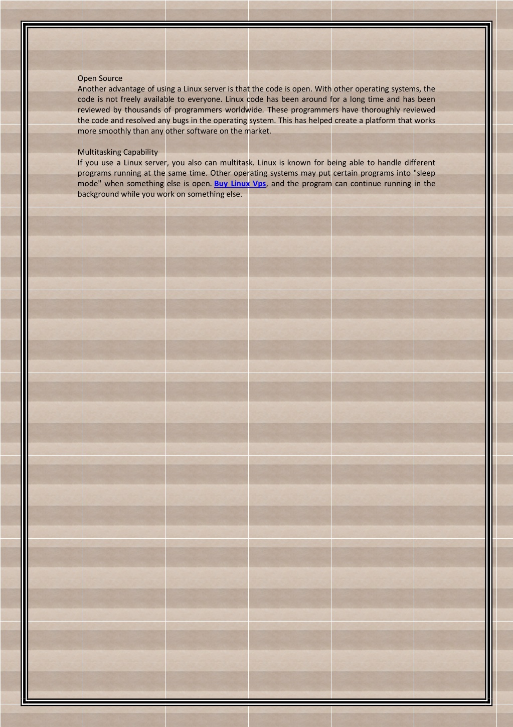 Open Source Another advantage of using a Linux server is that the code is open. With other operating systems, the code is not freely available to everyone. Linux code has been around for a long time and has been reviewed by thousands of programmers worldwide. These programmers have thoroughly reviewed the code and resolved any bugs in the operating system. This has helped create a platform that works more smoothly than any other software on the market. Multitasking Capability If you use a Linux server, you also can multitask. Linux is known for being able to handle different programs running at the same time. Other operating systems may put certain programs into "sleep mode" when something else is open. Buy Linux Vps, and the program can continue running in the background while you work on something else.