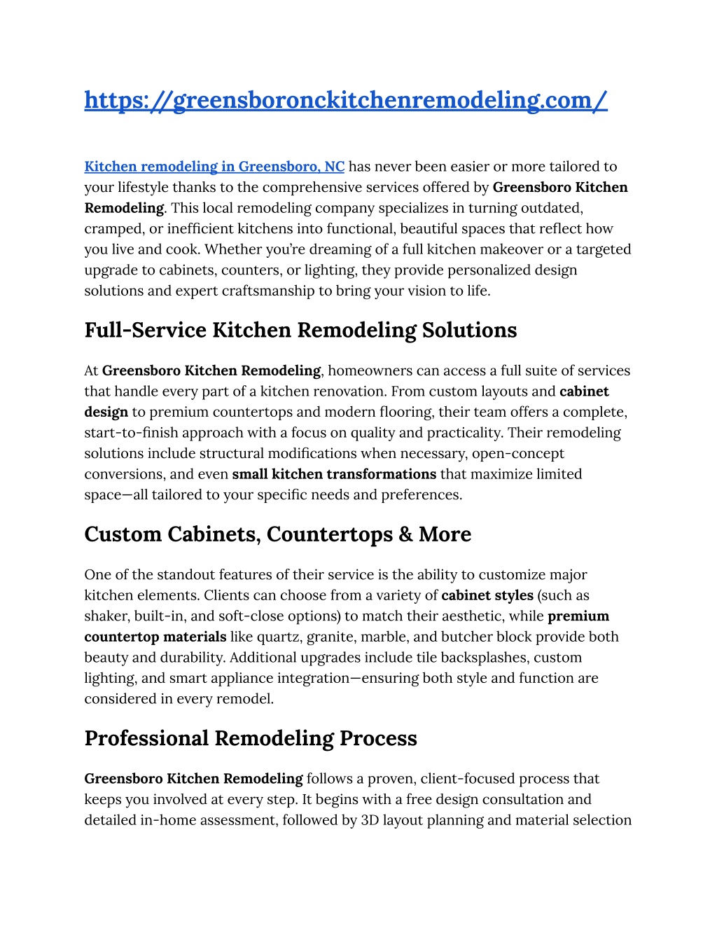 1. https:/ /greensboronckitchenremodeling.com/ Kitchen remodeling in Greensboro, NC has never been easier or more tailored to your lifestyle thanks to the comprehensive services offered by Greensboro Kitchen Remodeling. This local remodeling company specializes in turning outdated, cramped, or inefficient kitchens into functional, beautiful spaces that reflect how you live and cook. Whether you’re dreaming of a full kitchen makeover or a targeted upgrade to cabinets, counters, or lighting, they provide personalized design solutions and expert craftsmanship to bring your vision to life. Full-Service Kitchen Remodeling Solutions At Greensboro Kitchen Remodeling, homeowners can access a full suite of services that handle every part of a kitchen renovation. From custom layouts and cabinet design to premium countertops and modern flooring, their team offers a complete, start-to-finish approach with a focus on quality and practicality. Their remodeling solutions include structural modifications when necessary, open-concept conversions, and even small kitchen transformations that maximize limited space—all tailored to your specific needs and preferences. Custom Cabinets, Countertops & More One of the standout features of their service is the ability to customize major kitchen elements. Clients can choose from a variety of cabinet styles (such as shaker, built-in, and soft-close options) to match their aesthetic, while premium countertop materials like quartz, granite, marble, and butcher block provide both beauty and durability. Additional upgrades include tile backsplashes, custom lighting, and smart appliance integration—ensuring both style and function are considered in every remodel. Professional Remodeling Process Greensboro Kitchen Remodeling follows a proven, client-focused process that keeps you involved at every step. It begins with a free design consultation and detailed in-home assessment, followed by 3D layout planning and material selection