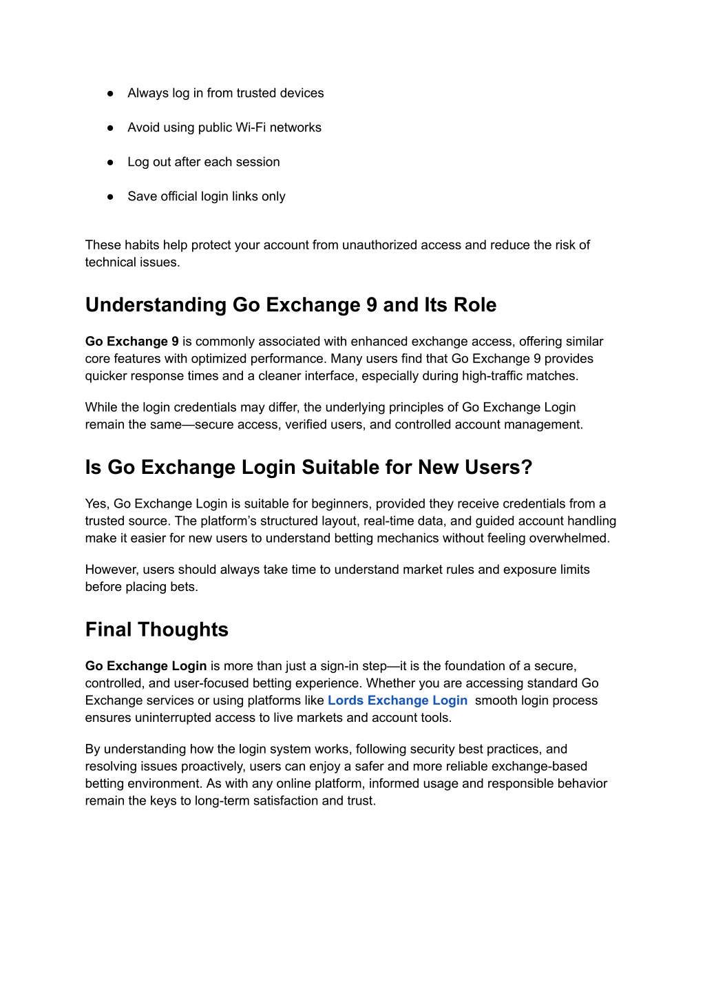 ● Always log in from trusted devices ● Avoid using public Wi-Fi networks ● Log out after each session ● Save official login links only These habits help protect your account from unauthorized access and reduce the risk of technical issues. Understanding Go Exchange 9 and Its Role Go Exchange 9 is commonly associated with enhanced exchange access, offering similar core features with optimized performance. Many users find that Go Exchange 9 provides quicker response times and a cleaner interface, especially during high-traffic matches. While the login credentials may differ, the underlying principles of Go Exchange Login remain the same—secure access, verified users, and controlled account management. Is Go Exchange Login Suitable for New Users? Yes, Go Exchange Login is suitable for beginners, provided they receive credentials from a trusted source. The platform’s structured layout, real-time data, and guided account handling make it easier for new users to understand betting mechanics without feeling overwhelmed. However, users should always take time to understand market rules and exposure limits before placing bets. Final Thoughts Go Exchange Login is more than just a sign-in step—it is the foundation of a secure, controlled, and user-focused betting experience. Whether you are accessing standard Go Exchange services or using platforms like Lords Exchange Login smooth login process ensures uninterrupted access to live markets and account tools. By understanding how the login system works, following security best practices, and resolving issues proactively, users can enjoy a safer and more reliable exchange-based betting environment. As with any online platform, informed usage and responsible behavior remain the keys to long-term satisfaction and trust.