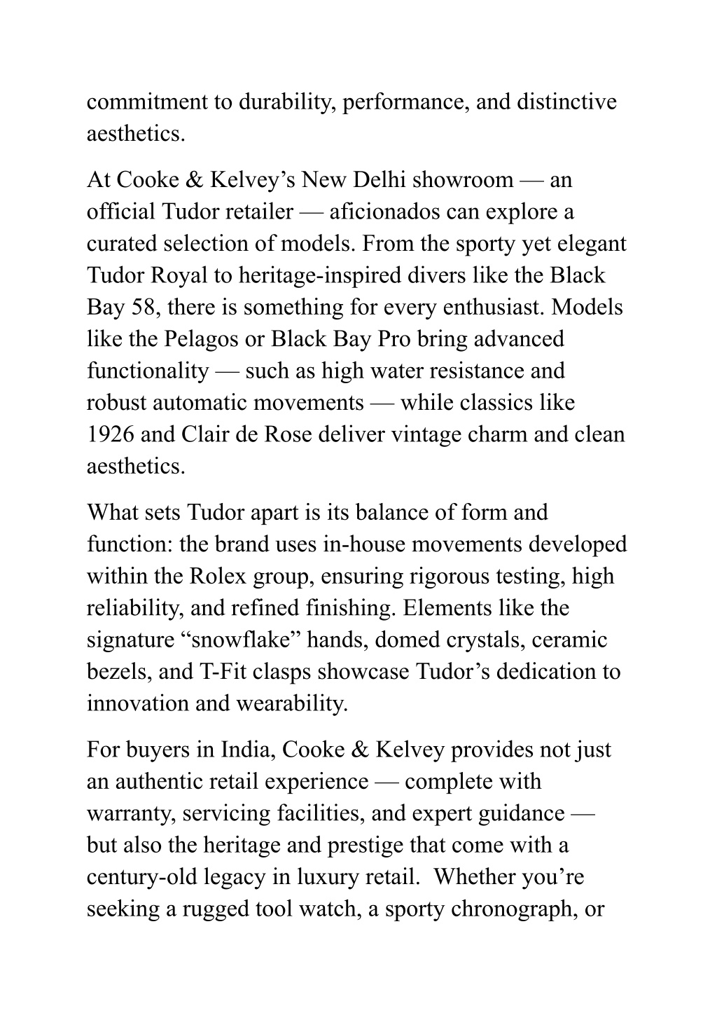 commitment to durability, performance, and distinctive aesthetics. At Cooke & Kelvey’s New Delhi showroom — an official Tudor retailer — aficionados can explore a curated selection of models. From the sporty yet elegant Tudor Royal to heritage-inspired divers like the Black Bay 58, there is something for every enthusiast. Models like the Pelagos or Black Bay Pro bring advanced functionality — such as high water resistance and robust automatic movements — while classics like 1926 and Clair de Rose deliver vintage charm and clean aesthetics. What sets Tudor apart is its balance of form and function: the brand uses in-house movements developed within the Rolex group, ensuring rigorous testing, high reliability, and refined finishing. Elements like the signature “snowflake” hands, domed crystals, ceramic bezels, and T-Fit clasps showcase Tudor’s dedication to innovation and wearability. For buyers in India, Cooke & Kelvey provides not just an authentic retail experience — complete with warranty, servicing facilities, and expert guidance — but also the heritage and prestige that come with a century-old legacy in luxury retail. Whether you’re seeking a rugged tool watch, a sporty chronograph, or