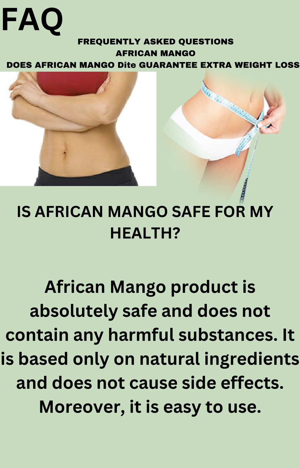 FAQ FREQUENTLY ASKED QUESTIONS AFRICAN MANGO DOES AFRICAN MANGO Dite GUARANTEE EXTRA WEIGHT LOSS IS AFRICAN MANGO SAFE FOR MY HEALTH? African Mango product is absolutely safe and does not contain any harmful substances. It is based only on natural ingredients and does not cause side effects. Moreover, it is easy to use.