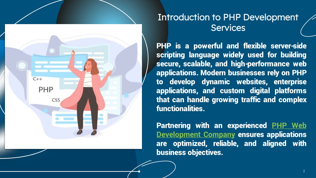 Introduction to PHP Development Services PHP is a powerful and flexible server-side scripting language widely used for building secure, scalable, and high-performance web applications. Modern businesses rely on PHP to develop dynamic websites, enterprise applications, and custom digital platforms that can handle growing traffic and complex functionalities. Partnering with an experienced PHP Web Development Company ensures applications are optimized, reliable, and aligned with business objectives.
