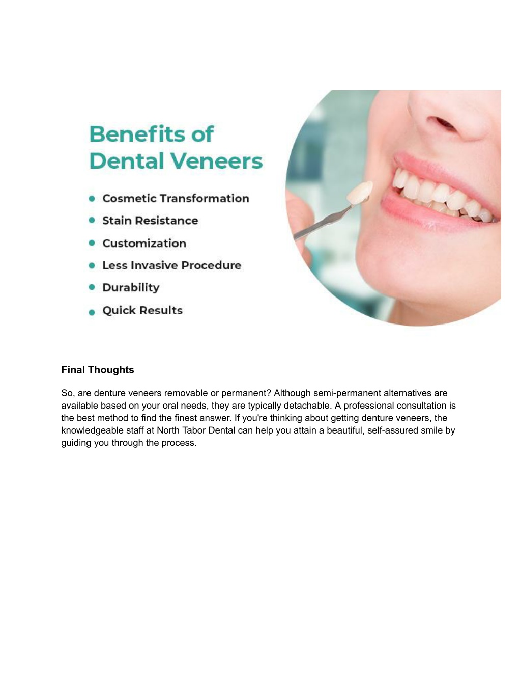 Final Thoughts So, are denture veneers removable or permanent? Although semi-permanent alternatives are available based on your oral needs, they are typically detachable. A professional consultation is the best method to find the finest answer. If you're thinking about getting denture veneers, the knowledgeable staff at North Tabor Dental can help you attain a beautiful, self-assured smile by guiding you through the process.