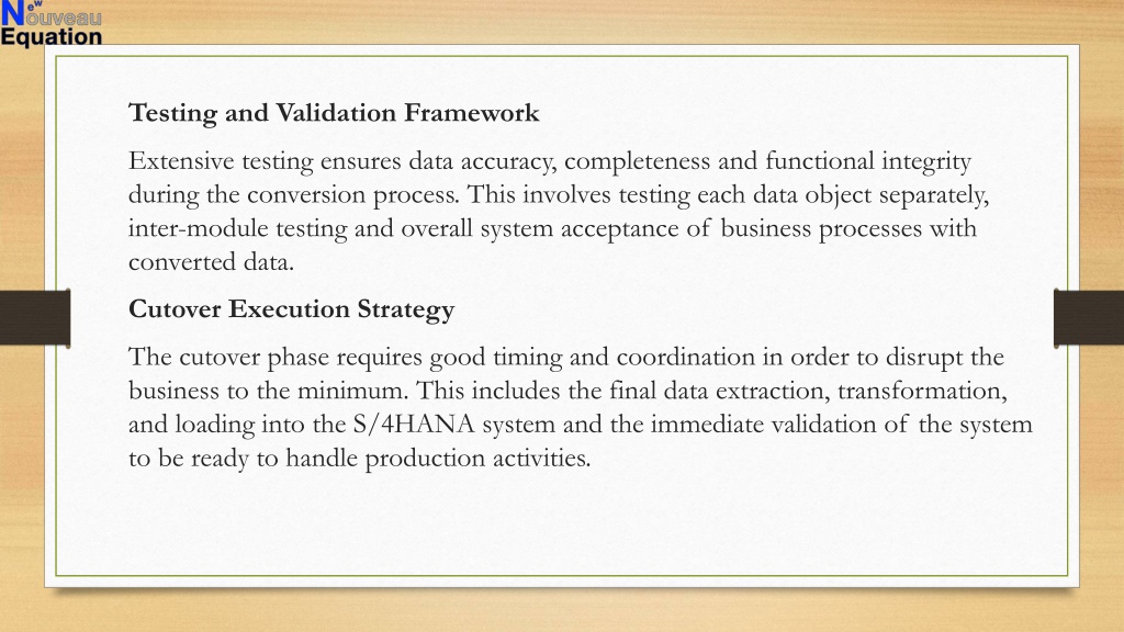 Testing and Validation Framework Extensive testing ensures data accuracy, completeness and functional integrity during the conversion process. This involves testing each data object separately, inter-module testing and overall system acceptance of business processes with converted data. Cutover Execution Strategy The cutover phase requires good timing and coordination in order to disrupt the business to the minimum. This includes the final data extraction, transformation, and loading into the S/4HANA system and the immediate validation of the system to be ready to handle production activities.