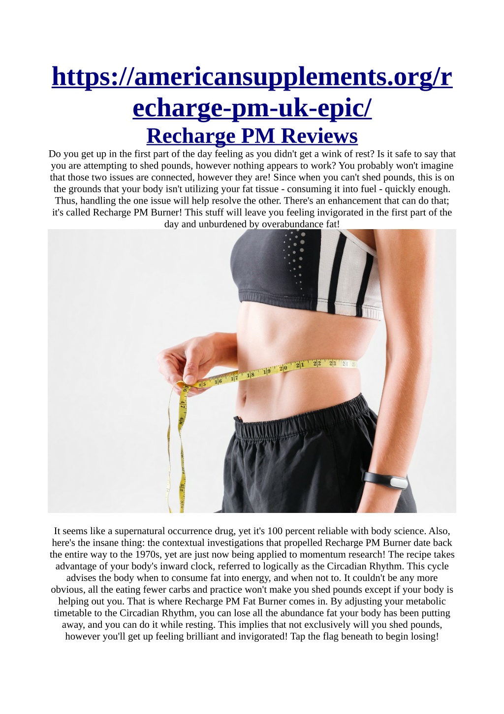 https://americansupplements.org/r echarge-pm-uk-epic/ Recharge PM Reviews Do you get up in the first part of the day feeling as you didn't get a wink of rest? Is it safe to say that you are attempting to shed pounds, however nothing appears to work? You probably won't imagine that those two issues are connected, however they are! Since when you can't shed pounds, this is on the grounds that your body isn't utilizing your fat tissue - consuming it into fuel - quickly enough. Thus, handling the one issue will help resolve the other. There's an enhancement that can do that; it's called Recharge PM Burner! This stuff will leave you feeling invigorated in the first part of the day and unburdened by overabundance fat! It seems like a supernatural occurrence drug, yet it's 100 percent reliable with body science. Also, here's the insane thing: the contextual investigations that propelled Recharge PM Burner date back the entire way to the 1970s, yet are just now being applied to momentum research! The recipe takes advantage of your body's inward clock, referred to logically as the Circadian Rhythm. This cycle advises the body when to consume fat into energy, and when not to. It couldn't be any more obvious, all the eating fewer carbs and practice won't make you shed pounds except if your body is helping out you. That is where Recharge PM Fat Burner comes in. By adjusting your metabolic timetable to the Circadian Rhythm, you can lose all the abundance fat your body has been putting away, and you can do it while resting. This implies that not exclusively will you shed pounds, however you'll get up feeling brilliant and invigorated! Tap the flag beneath to begin losing!