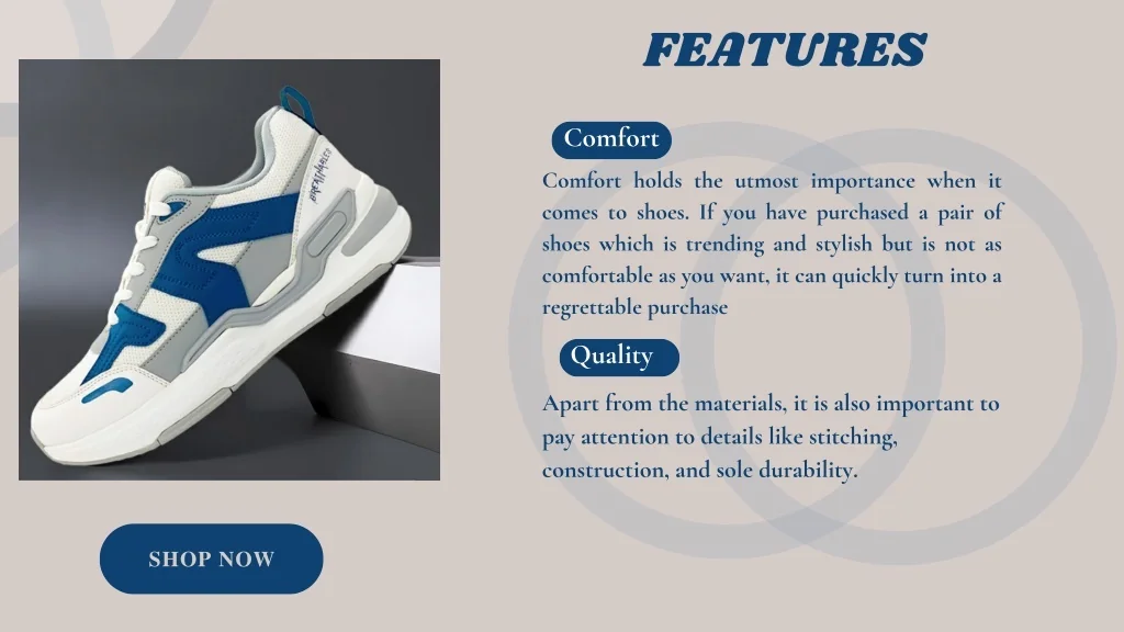 FEATURES Comfort Comfort holds the utmost importance when it comes to shoes. If you have purchased a pair of shoes which is trending and stylish but is not as comfortable as you want, it can quickly turn into a regrettable purchase Quality Apart from the materials, it is also important to pay attention to details like stitching, construction, and sole durability. SHOP NOW