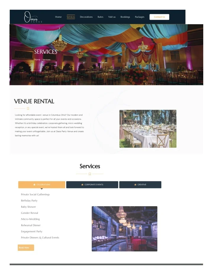 Home Services Decorations Rates Visit us Bookings Packages Contact Us SERVICES Home Services VENUE RENTAL Looking for affordable event venue in Columbus Ohio? Our modern and intimate community space is perfect for all your events and occasions. Whether it’s a birthday celebration, corporate gathering, micro wedding reception, or any special event, we’ve hosted them all and look forward to making your event unforgettable. Join us at Oasis Party Venue and create lasting memories with us! Services CELEBRATIONS CORPORATE EVENTS CREATIVE Private Social Gatherings Birthday Party Baby Shower Gender Reveal Micro-Wedding Rehearsal Dinner Engagement Party Private Dinners & Cultural Events Book Now