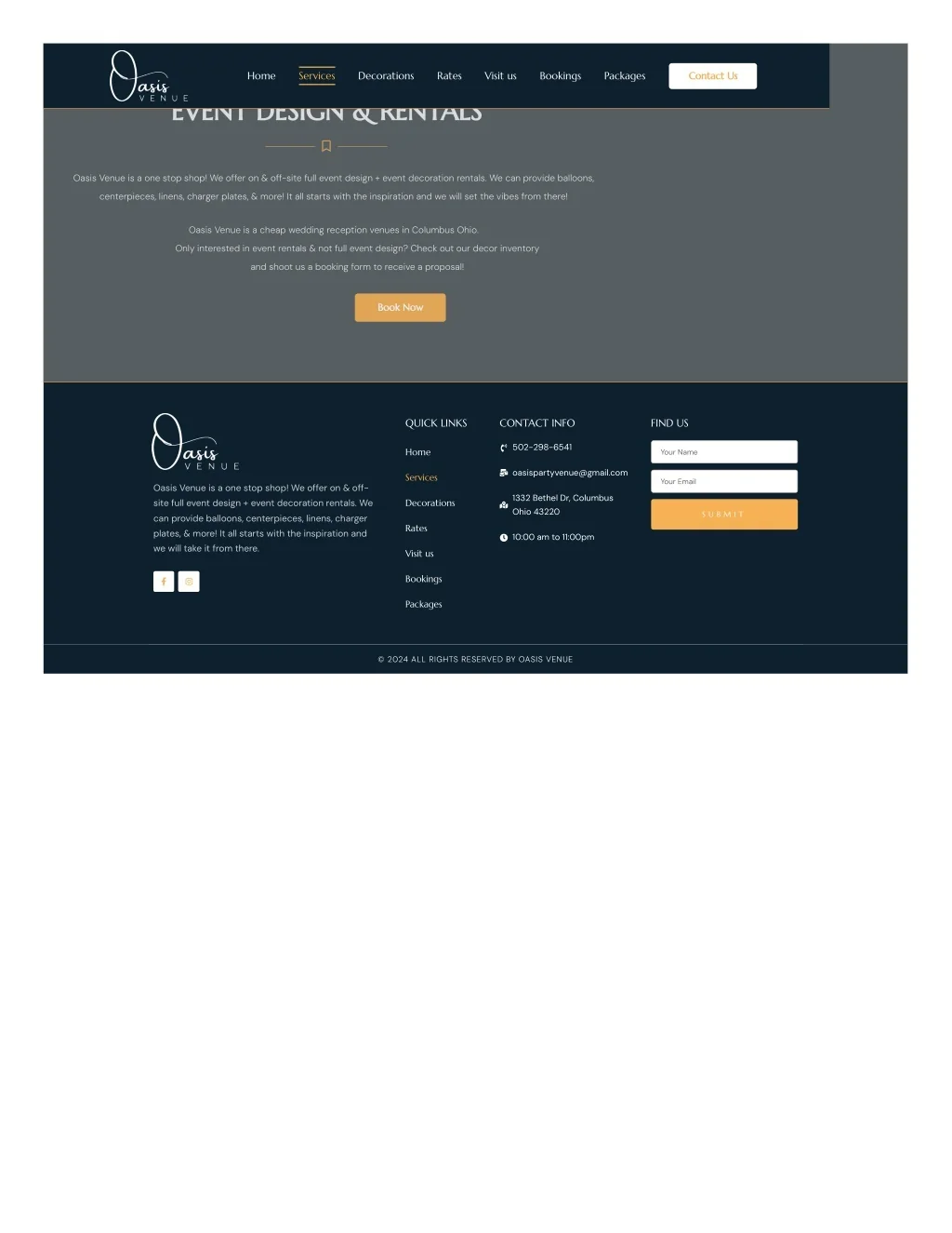 Home Services Decorations Rates Visit us Bookings Packages Contact Us EVENT DESIGN & RENTALS Oasis Venue is a one stop shop! We offer on & off-site full event design + event decoration rentals. We can provide balloons, centerpieces, linens, charger plates, & more! It all starts with the inspiration and we will set the vibes from there! Oasis Venue is a cheap wedding reception venues in Columbus Ohio. Only interested in event rentals & not full event design? Check out our decor inventory and shoot us a booking form to receive a proposal! Book Now QUICK LINKS CONTACT INFO FIND US 502-298-6541 Home Your Name oasispartyvenue@gmail.com Services Your Email Oasis Venue is a one stop shop! We offer on & off- 1332 Bethel Dr, Columbus Decorations site full event design + event decoration rentals. We Ohio 43220 S U B M I T can provide balloons, centerpieces, linens, charger Rates plates, & more! It all starts with the inspiration and 10:00 am to 11:00pm we will take it from there. Visit us Bookings Packages © 2024 ALL RIGHTS RESERVED BY OASIS VENUE