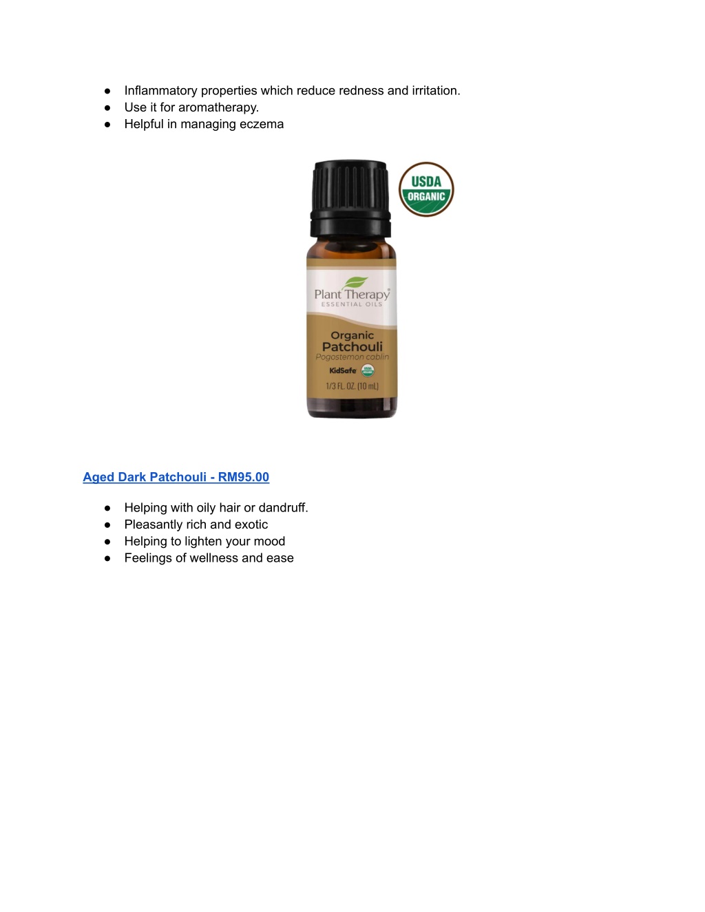 ● ● ● Inflammatory properties which reduce redness and irritation. Use it for aromatherapy. Helpful in managing eczema Aged Dark Patchouli - RM95.00 ● ● ● ● Helping with oily hair or dandruff. Pleasantly rich and exotic Helping to lighten your mood Feelings of wellness and ease
