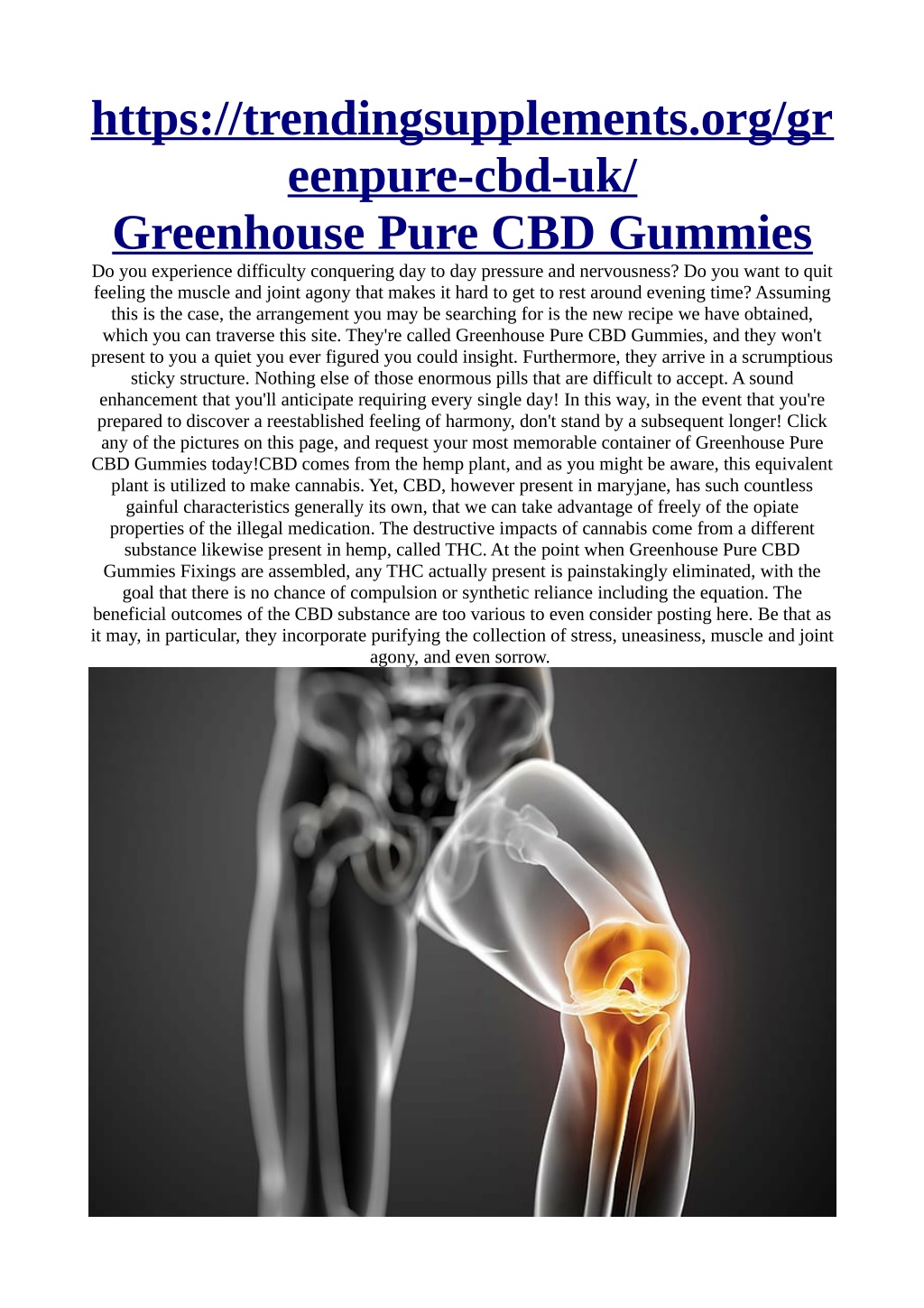 https://trendingsupplements.org/gr eenpure-cbd-uk/ Greenhouse Pure CBD Gummies Do you experience difficulty conquering day to day pressure and nervousness? Do you want to quit feeling the muscle and joint agony that makes it hard to get to rest around evening time? Assuming this is the case, the arrangement you may be searching for is the new recipe we have obtained, which you can traverse this site. They're called Greenhouse Pure CBD Gummies, and they won't present to you a quiet you ever figured you could insight. Furthermore, they arrive in a scrumptious sticky structure. Nothing else of those enormous pills that are difficult to accept. A sound enhancement that you'll anticipate requiring every single day! In this way, in the event that you're prepared to discover a reestablished feeling of harmony, don't stand by a subsequent longer! Click any of the pictures on this page, and request your most memorable container of Greenhouse Pure CBD Gummies today!CBD comes from the hemp plant, and as you might be aware, this equivalent plant is utilized to make cannabis. Yet, CBD, however present in maryjane, has such countless gainful characteristics generally its own, that we can take advantage of freely of the opiate properties of the illegal medication. The destructive impacts of cannabis come from a different substance likewise present in hemp, called THC. At the point when Greenhouse Pure CBD Gummies Fixings are assembled, any THC actually present is painstakingly eliminated, with the goal that there is no chance of compulsion or synthetic reliance including the equation. The beneficial outcomes of the CBD substance are too various to even consider posting here. Be that as it may, in particular, they incorporate purifying the collection of stress, uneasiness, muscle and joint agony, and even sorrow.