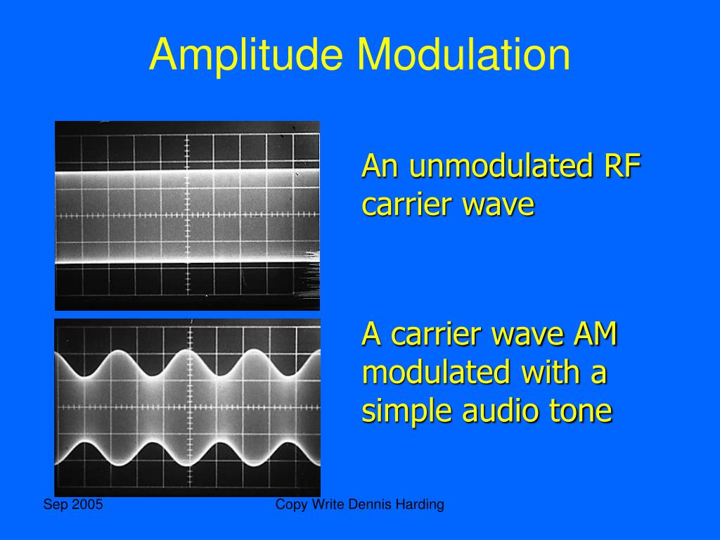 Amplitude Modulation An unmodulated RF carrier wave A carrier wave AM modulated with a simple audio tone Copy Write Dennis Harding