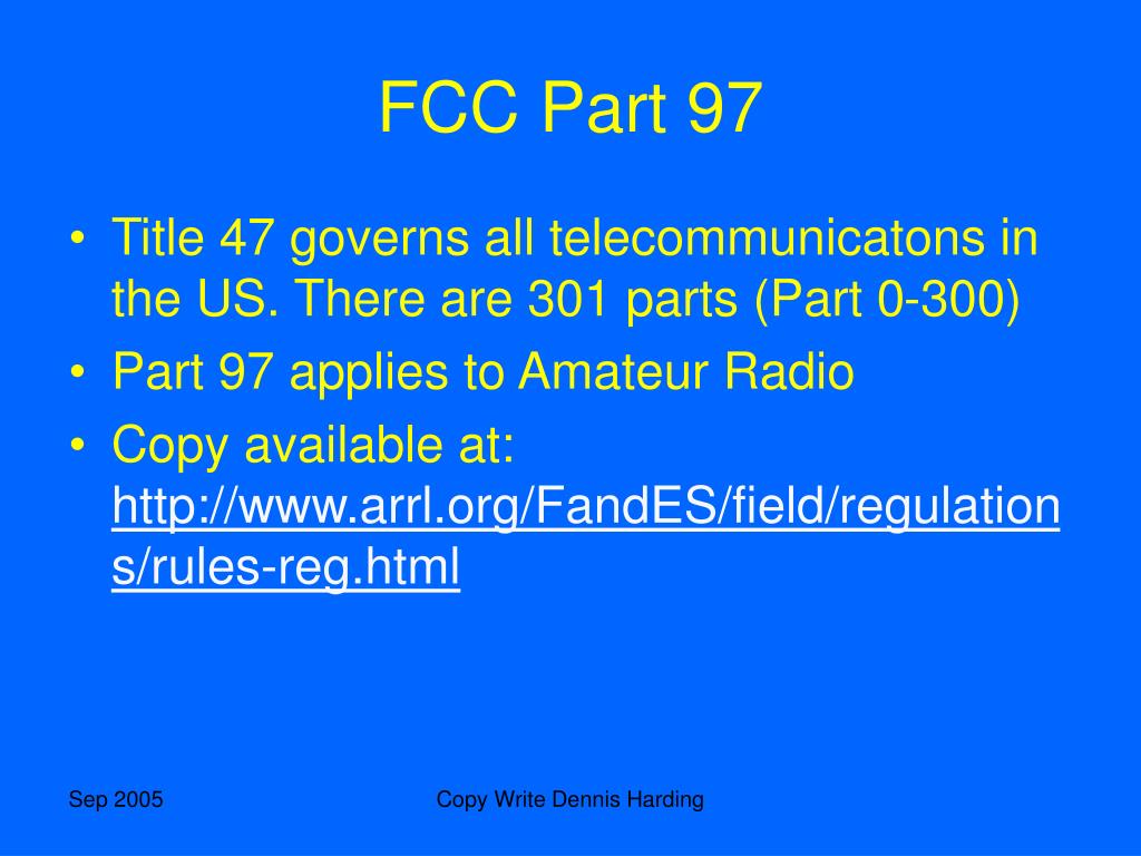 FCC Part 97 • Title 47 governs all telecommunicatons in the US. There are 301 parts (Part 0-300) • Part 97 applies to Amateur Radio • Copy available at: http://www.arrl.org/FandES/field/regulations/rules-reg.html Copy Write Dennis Harding