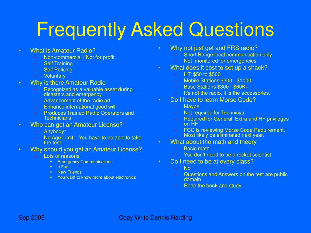 What is Amateur Radio? Non-commercial / Not for profit Self Training Self Policing Voluntary Why is there Amateur Radio Recognized as a valuable asset during disasters and emergency. Advancement of the radio art. Enhance international good will. Produces Trained Radio Operators and Technicians Who can get an Amateur License? Anybody* No Age Limit – You have to be able to take the test. Why should you get an Amateur License? Lots of reasons Emergency Communications It Fun New Friends You want to know more about electronics Why not just get and FRS radio? Short Range local communication only Not monitored for emergencies What does it cost to set up a shack? HT: $50 to $500 Mobile Stations $300 - $1000 Base Stations $300 - $60K+ It’s not the radio, it is the accessories. Do I have to learn Morse Code? Maybe Not required for Technician Required for General, Extra and HF privileges on HF FCC is reviewing Morse Code Requirement. Most likely be eliminated next year. What about the math and theory Basic math You don’t need to be a rocket scientist Do I need to be at every class? No Questions and Answers on the test are public domain Read the book and study. Frequently Asked Questions Copy Write Dennis Harding