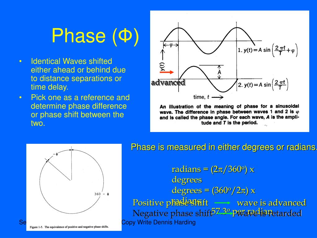 advanced Phase is measured in either degrees or radians. radians = (2p/360o) x degreesdegrees = (360o/2p) x radians 57.3o per radian Positive phase shift wave is advancedNegative phase shift wave is retarded Phase (Ф) • Identical Waves shifted either ahead or behind due to distance separations or time delay. • Pick one as a reference and determine phase difference or phase shift between the two. Copy Write Dennis Harding