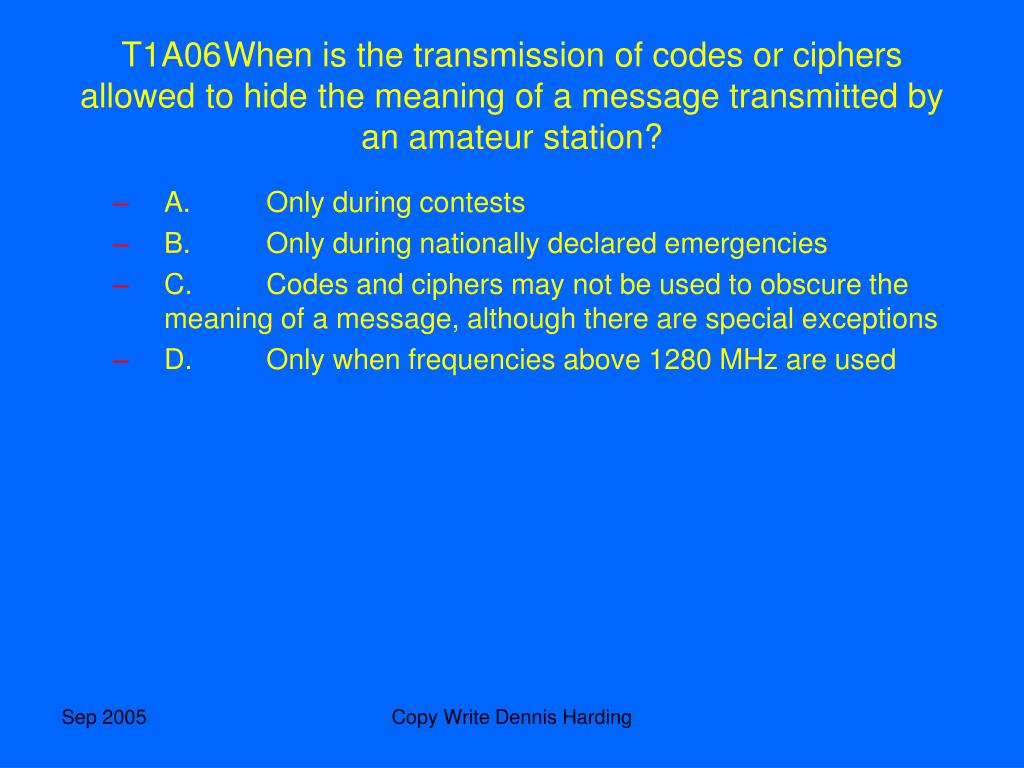 T1A06 When is the transmission of codes or ciphers allowed to hide the meaning of a message transmitted by an amateur station? • A. Only during contests • B. Only during nationally declared emergencies • C. Codes and ciphers may not be used to obscure the meaning of a message, although there are special exceptions • D. Only when frequencies above 1280 MHz are used Copy Write Dennis Harding