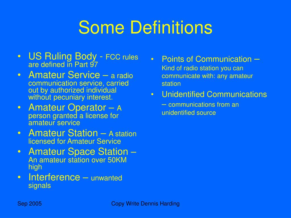 US Ruling Body - FCC rules are defined in Part 97 Amateur Service – a radio communication service, carried out by authorized individual without pecuniary interest. Amateur Operator – A person granted a license for amateur service Amateur Station – A station licensed for Amateur Service Amateur Space Station – An amateur station over 50KM high Interference – unwanted signals Points of Communication – Kind of radio station you can communicate with: any amateur station Unidentified Communications – communications from an unidentified source Some Definitions Copy Write Dennis Harding